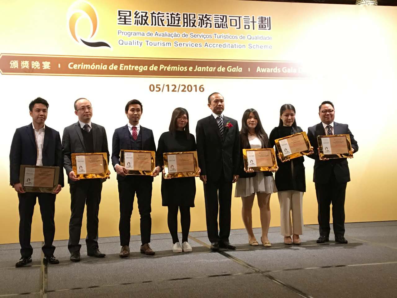 澳門旅遊局局長(zhǎng)文綺華(中)與獲頒星級(jí)服務(wù)商戶獎(jiǎng)的商戶負(fù)責(zé)人合照