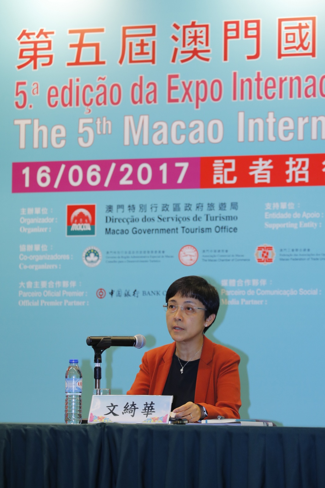 澳門旅遊局局長(zhǎng)文綺華在記者會(huì)上致辭