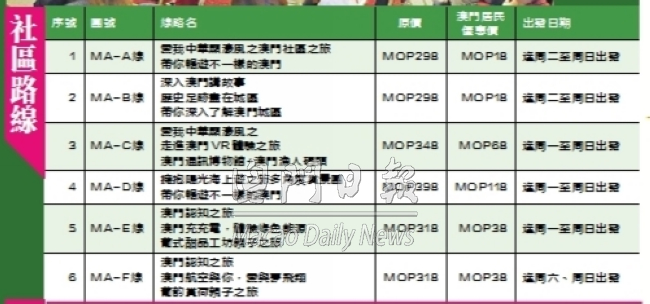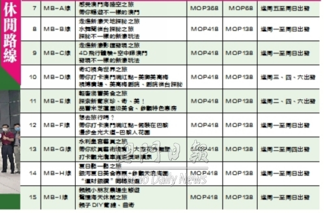 黃輝介紹,該十五條旅遊路線主要分為社區(qū)路線和休閒路線兩部分,出發(fā)地點(diǎn)安排在澳門的外港客運(yùn)港澳碼頭、氹仔北安碼頭。每位澳門居民可以優(yōu)惠的團(tuán)價(jià)分別參與一次社區(qū)路線遊及休閒路線遊,所有旅遊路線的本地居民優(yōu)惠價(jià)格由十八元到一百三十八元不等?;顒?dòng)已吸引合共一百四十八家澳門旅行社、約七百五十名導(dǎo)遊、逾五百臺(tái)旅遊大巴和五百位旅遊巴司機(jī),以及逾七百名前線旅遊從業(yè)人員參與,預(yù)計(jì)屆時(shí)將帶動(dòng)四十萬(wàn)人次參與活動(dòng)。