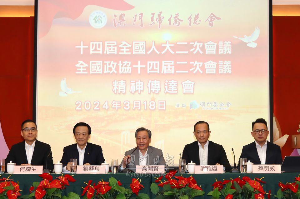 【澳門(mén)日?qǐng)?bào)消息】澳門(mén)歸僑總會(huì)於周一下午三時(shí)半在會(huì)址召開(kāi)“全國(guó)兩會(huì)精神傳達(dá)會(huì)”。全國(guó)人大常委高開(kāi)賢,全國(guó)政協(xié)常委何潤(rùn)生,澳區(qū)全國(guó)人大代表團(tuán)團(tuán)長(zhǎng)、僑總永遠(yuǎn)會(huì)長(zhǎng)劉藝良,全國(guó)政協(xié)常委、僑總會(huì)長(zhǎng)劉雅煌,全國(guó)政協(xié)澳區(qū)委員、僑總副會(huì)長(zhǎng)蔡明威分別講述在兩會(huì)期間的工作重點(diǎn)及體會(huì)。